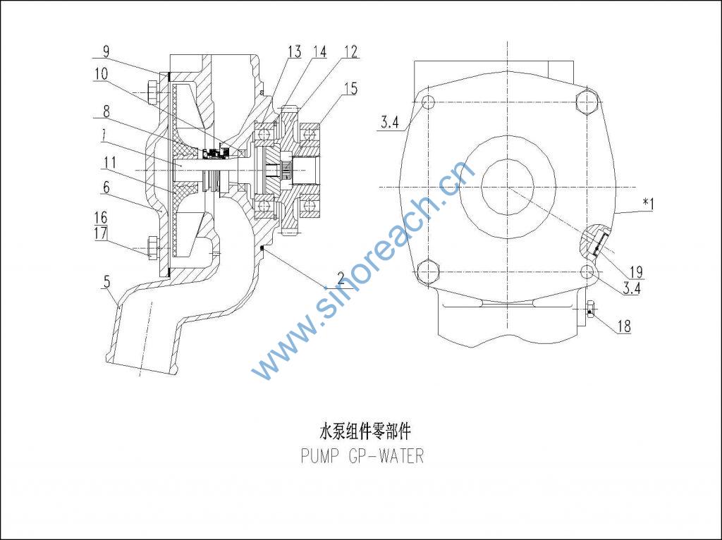 1 水泵部件 PUMP AS. C20AB-2W8002+C 2 O型密封圈 SEAL U641A-5F3106+A 3 六角头螺栓 BOLT U311A-0T0055+A 4 垫圈 WASHER U382A-5M2894+A (5) 水泵体 HOUSING-WATER PUMP C20AL-20AL001+C (6) 水泵盖 COVER-WATER PUMP C20AL-20AL004+B (7) 水泵轴 SHAFT-WATER PUMP C20AL-20AL002+A (8) 机械密封部件 SEAL GP-BASIC C20AB-20AB603+A (9) 垫片 GASKET C20AL-20AL005+A (10) 骨架油封 SEAL-FRAME TYPE C20AL-20AL006A+A (11) 水泵叶轮 IMPELLER-WATER PUMP C20AL-20AL003+A (12) 水泵齿轮焊接部件 GEAR ASSEMBLY-WATER PzUMP AS. C20AB-2W7678+B (13) GB/T276-6208/C3:深沟球轴承 BEARING B00000220 (14) GB/T893.1-80:孔用弹性挡圈 RING-RETAINING(INTERNAL) B00001050 (15) 十二角头螺栓 BOLT C20AL-20AL009+B (16) 垫圈 WASHER B00001237(GB/T93-10) (17) GB/T5783-M1025:六角头螺栓 BOLT B00000505